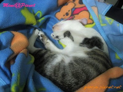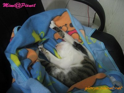 最近寒流很冷,mi都會跑到椅子上的棉被窩,結果睡成這樣XD我把棉被偷偷翻開照,還被牠抗議XD不曉得為什麼手會伸成那樣,你是想飛飛嗎mi