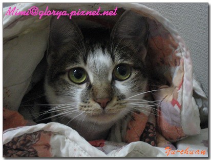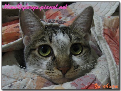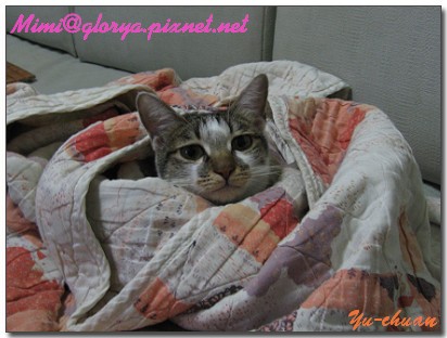 發現牠整個在棉被裡面只剩下頭...